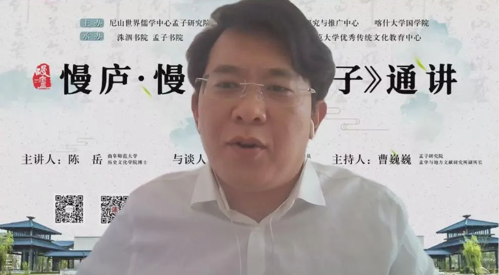 2022年10月29日下午,由曲阜师范大学礼乐文化研究与推广中心、尼山世界儒学中心孟子研究院、喀什大学国学院联合主办,洙泗书院、孟子书院承办的“慢庐·慢读”之《孟子》通讲第十七期举行。本期由曲阜师范大学历史文化学院博士陈岳担任主讲人,孟子研究院副研究馆员、孟子书院执行院长殷延禄担任与谈人,孟子研究院孟学与地方文献研究所副所长曹巍巍担任主持人。因疫情防控原因,本期活动在线上举行,约有60余位学友在线上参与了活动。