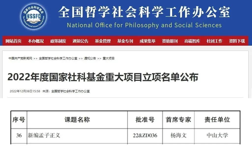 近日,2022年度国家社科基金重大项目立项名单公布。我院特聘专家杨海文教授的“新编孟子正义”荣获国家社会科学基金重大项目立项。