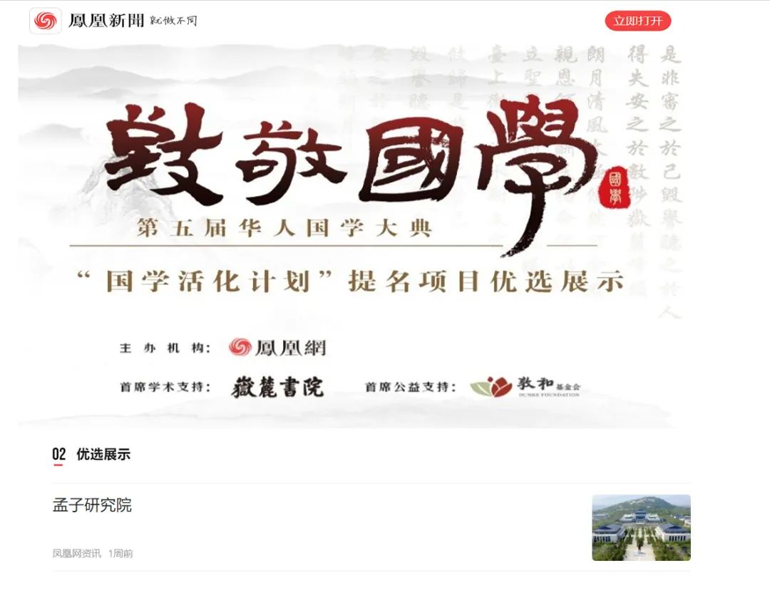 2022年7月29日上午,由凤凰网主办、面向海内外中华儿女的大型文化公益传播活动“致敬国学:第五届华人国学大典”在线启动。该活动由湖南大学岳麓书院提供首席学术支持,敦和基金会提供首席公益支持,人本智汇、政邦智库协办,活动以“亲近传统 重建斯文”为主题,有奖征集原创文章或原创短音视频,分享与中华文化、中华传统相关的非虚构故事、学习研究心得,或者形象展示传统文化实践体悟、创新应用的成果,具体包括旨在推动国学研究的“国学耆宿计划”和“国学星斗计划”,以及旨在提升传统文化传播普及与转化应用能力的“国学活化计划”,总资助额为250万元。