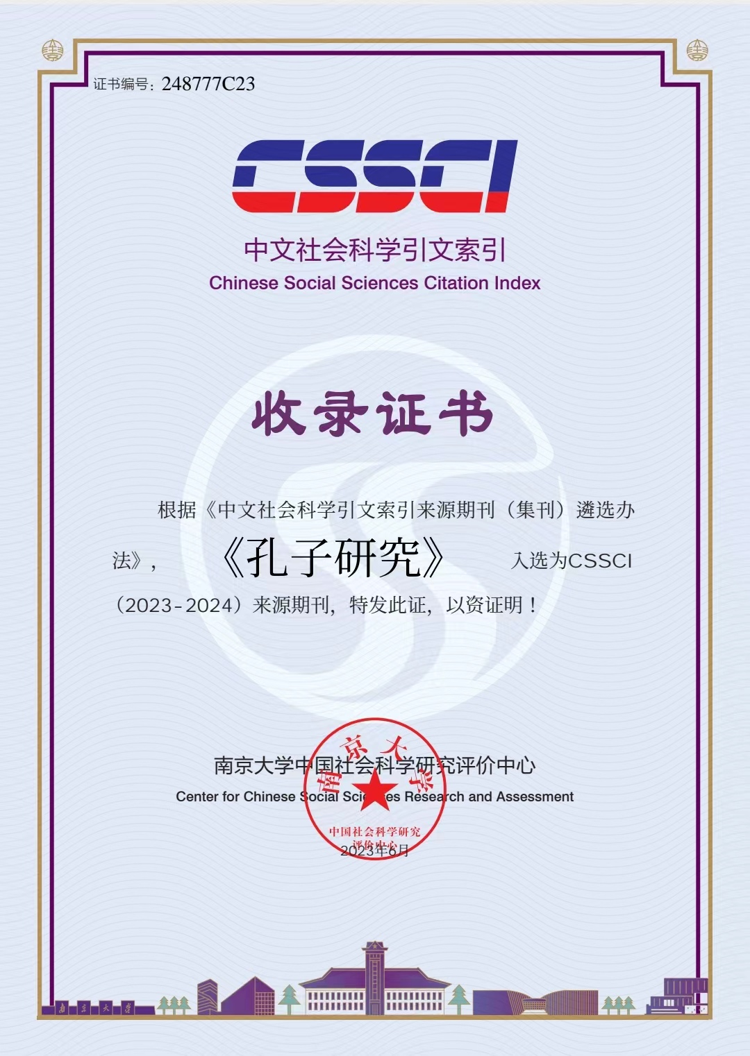 近日,《孔子研究》编辑部收到南京大学中国社会科学研究评价中心来函,根据《中文社会科学引文索引来源期刊(集刊)遴选办法》,《孔子研究》入选CSSCI(2023—2024)来源期刊。