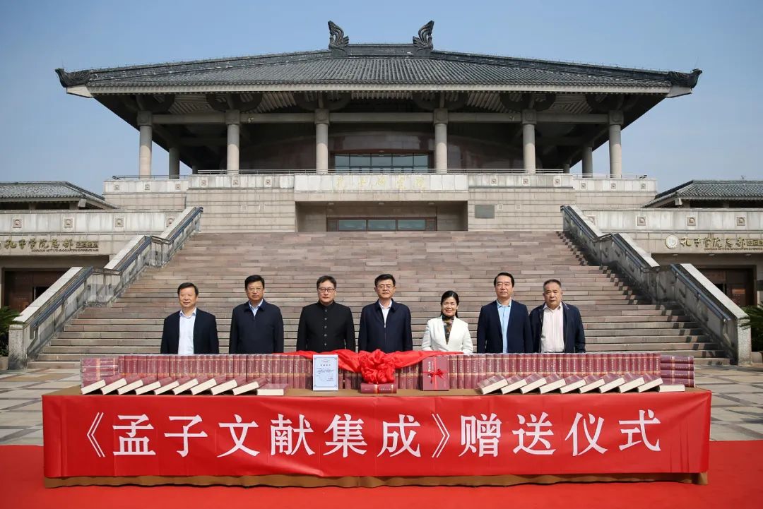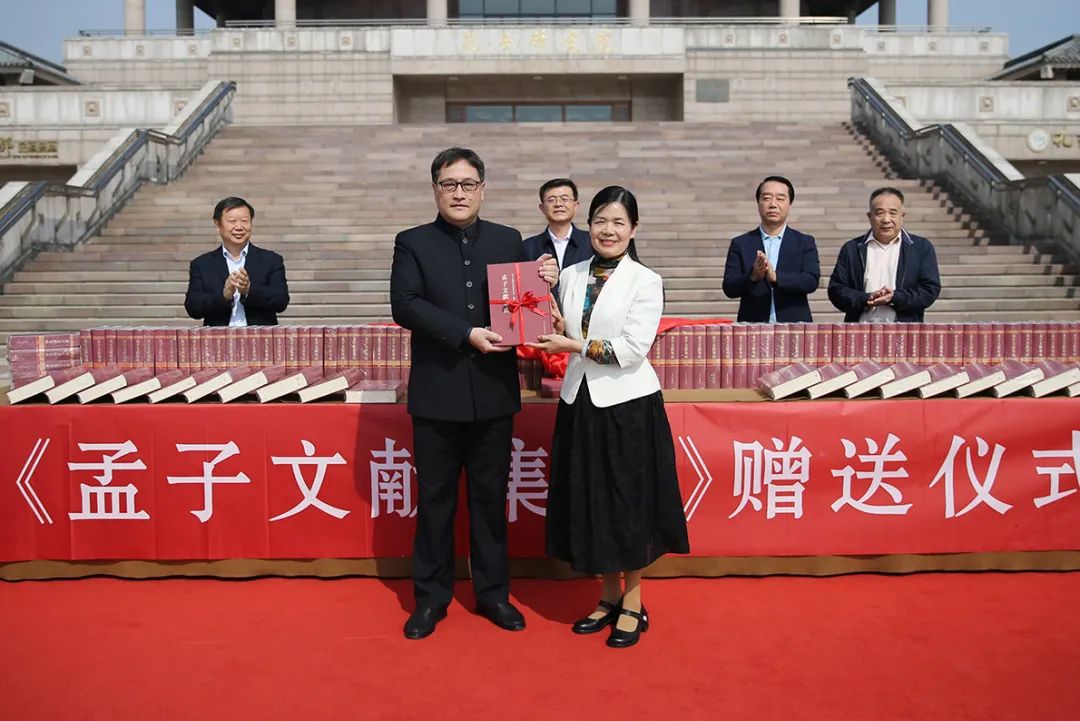 10月11日,《孟子文献集成》赠送仪式在孔子研究院辟雍广场举行。尼山世界儒学中心副主任、孔子研究院党委书记朱瑞显,孔子研究院副院长刘续兵、袁汝旭,纪委书记张新杰和孟子研究院党委书记、院长陈晓霞,副院长赵龙、毛景卫参加赠书仪式。