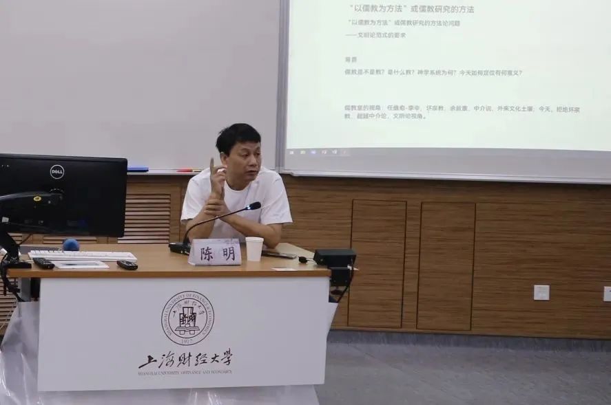 在热烈的氛围下,中国社会科学院世界宗教研究所张宏斌研究员主持了本次研讨会的主旨发言环节。湘潭大学陈明教授从方法意义上指出儒教接续的可能。在以儒教为方法前提下,陈明教授概述了可能出现的突出问题,并进一步分析了文明视域下的相应范式要求。