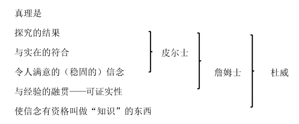 由美国哲学家皮尔士、詹姆士和杜威等人提出了实用主义真理观,概要图示如下: