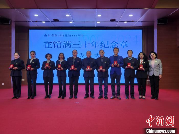 与会嘉宾先后为在馆工作满30年的离退休干部代表、在职馆员代表颁发“在馆三十年”纪念章。山东省图书馆还为2024年“创新发展论坛”获奖人员、“我与山东省图书馆的故事”征文获奖读者代表颁发证书,向青年馆员代表颁发建馆115周年纪念章。