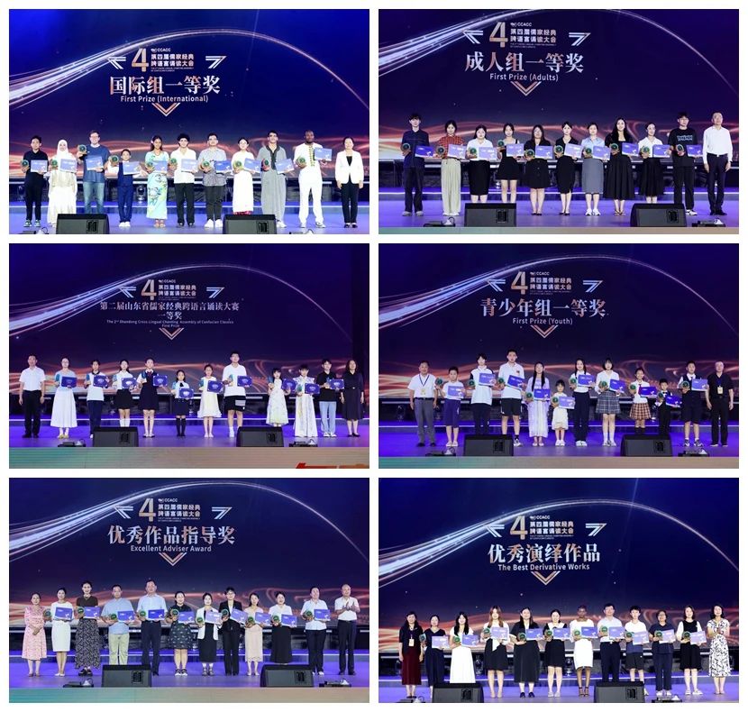 现场揭晓了“国际组一等奖”“成人组一等奖”“青少年组一等奖”“第二届山东省儒家经典跨语言诵读大赛一等奖”“优秀作品指导奖”“优秀演绎作品”等荣誉奖项。