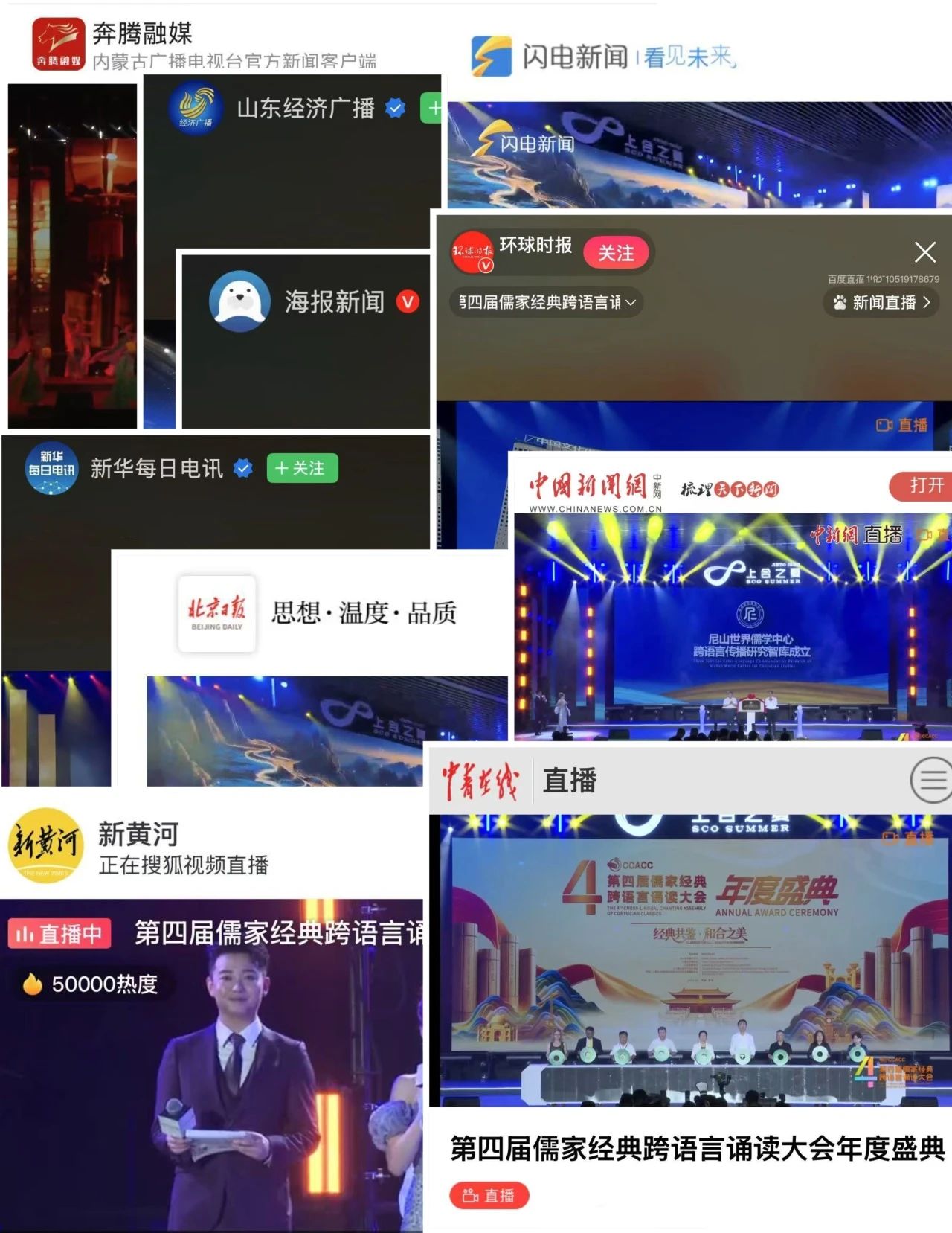 新华社、央视频、中国国际电视台(CGTN)、中国日报、百度、腾讯、爱奇艺、优酷、B 站、小红书,以及中华卫视、中东头条等平台的Facebook账号共100余个网络平台对盛典进行了全程直播,在线观看量突破3400余万。微博话题#多语论语混搭风绝了#登上青岛同城热搜榜。美联社、福克斯新闻、加拿大财经周刊、澳大利亚时报网、纽约日报、欧洲时报、新加坡早报、俄罗斯日报、西班牙电视台、非洲日报、日本新闻、韩国日报等300余家海外媒体争相报道,在海外引起强烈反响。