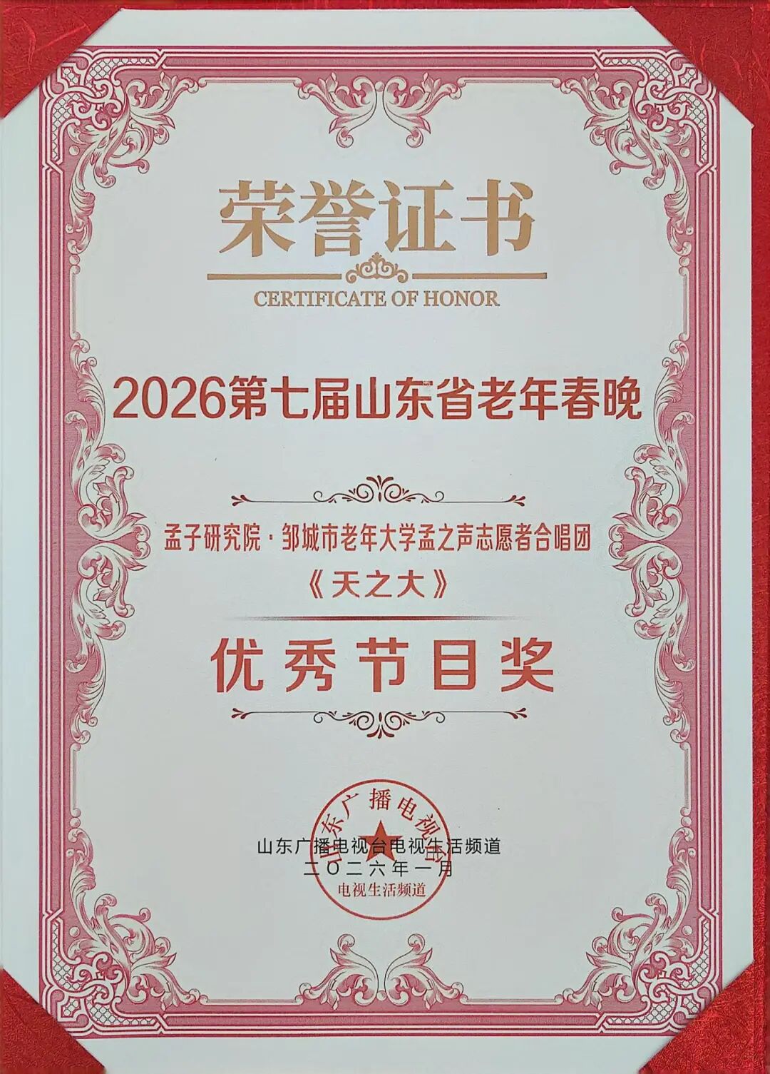 骏马启新岁,银龄绽芳华。近日,2026第七届山东省老年春晚在济南圆满完成录制,由孟子研究院·邹城市老年大学“孟之声”志愿者合唱团演唱的《天之大》节目,从众多参演节目中脱颖而出,荣获“2026第七届山东省老年春晚优秀节目奖”。这一荣誉既体现了合唱团良好的艺术修养,也展现了孟子思想与当代文艺实践相融合的蓬勃生命力。
