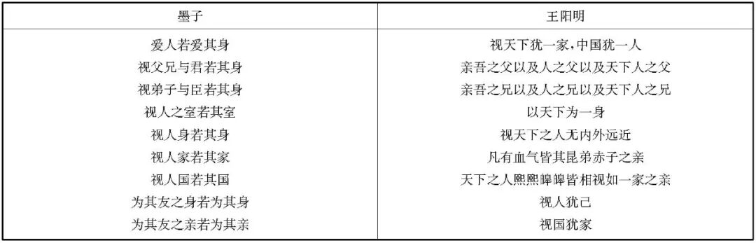我们可以把王阳明有关“万物一体之仁”的论述与墨子有关“兼爱”的表述列表做一对比: