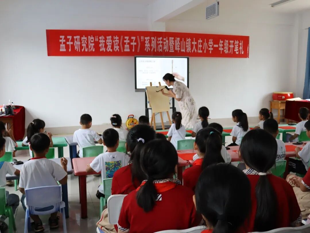 9月3日,孟子研究院“我爱读《孟子》”系列活动暨邹城市大庄小学开笔礼在峄山镇大庄小学举行。峄山镇政府、峄山镇中心学校、孟子研究院传承普及部工作人员及大庄小学全体师生二百余人齐聚一堂,以千年古礼为一年级新生开启人生第一课,让“启智立德、尊师重道”的儒家文脉,在庄重仪式中沁润童心。