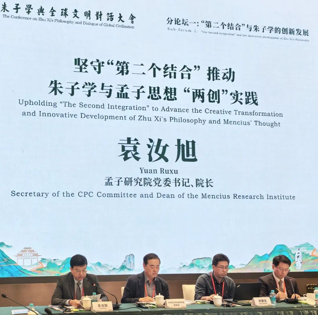 孟子研究院党委书记、院长袁汝旭受邀出席开幕式,并在“‘第二个结合’与朱子学的创新发展”分论坛作交流发言。袁汝旭介绍了孟子研究院的基本情况以及成立以来取得的主要成绩,围绕《坚守“第二个结合”推动朱子学与孟子思想“两创”实践》进行了分享。他建议通过举办专题论坛、工作坊等多种形式,促进孟学、朱子学与马克思主义理论的多学科交流,积极探索“第二个结合”的有效路径,让古老智慧在当下焕发新的生机与活力。