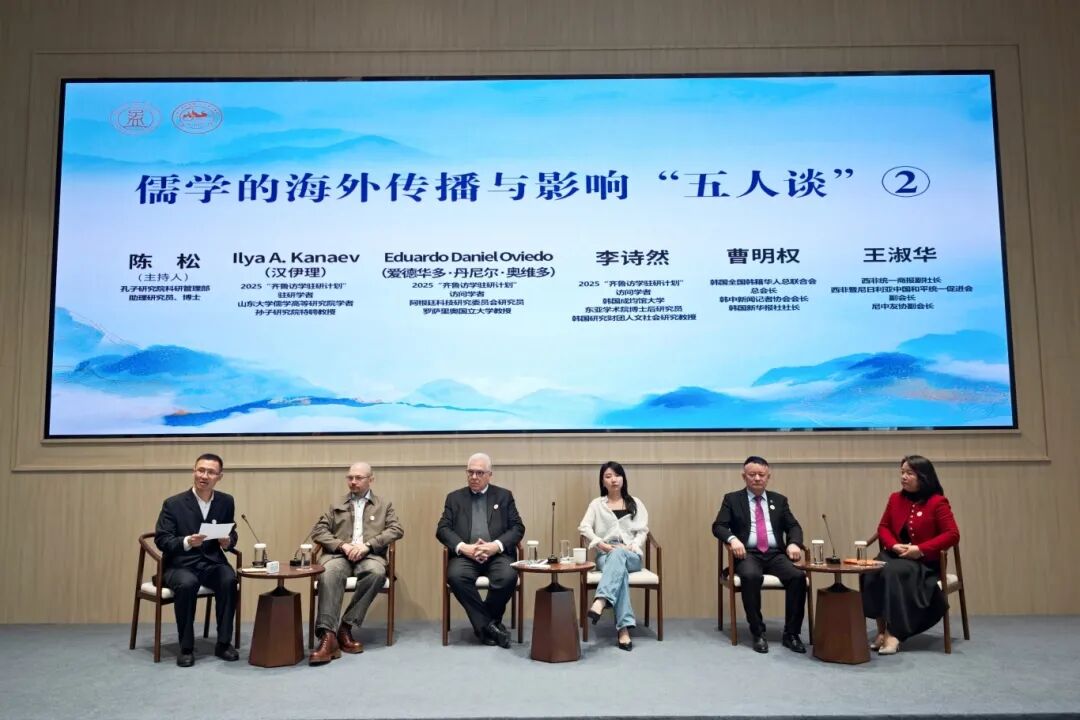 儒学的海外传播与影响“五人谈”第二组由孔子研究院科研管理部助理研究员陈松博士主持, 2025“齐鲁访学驻研计划”驻研学者、山东大学儒学高等研究院学者、孙子研究院特聘教授Ilya A. Kanaev(汉伊理),2025“齐鲁访学驻研计划”访问学者、阿根廷科技研究委员会研究员、阿根廷罗萨里奥国立大学教授Eduardo Daniel Oviedo(爱德华多·丹尼尔·奥维多),2025“齐鲁访学驻研计划”访问学者、韩国成均馆大学东亚学术院博士后研究员、韩国研究财团人文社会研究教授李诗然,韩国全国韩籍华人总联合会总会长、韩中新闻记者协会会长、韩国新华报社社长曹明权,西非统一商报副社长、西非暨尼日利亚中国和平统一促进会副会长、尼中友协副会长王淑华担任访谈嘉宾。
