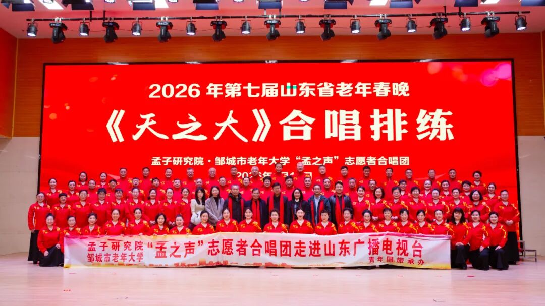 骏马启新岁,银龄绽芳华。近日,2026第七届山东省老年春晚在济南圆满完成录制,由孟子研究院·邹城市老年大学“孟之声”志愿者合唱团演唱的《天之大》节目,从众多参演节目中脱颖而出,荣获“2026第七届山东省老年春晚优秀节目奖”。这一荣誉既体现了合唱团良好的艺术修养,也展现了孟子思想与当代文艺实践相融合的蓬勃生命力。